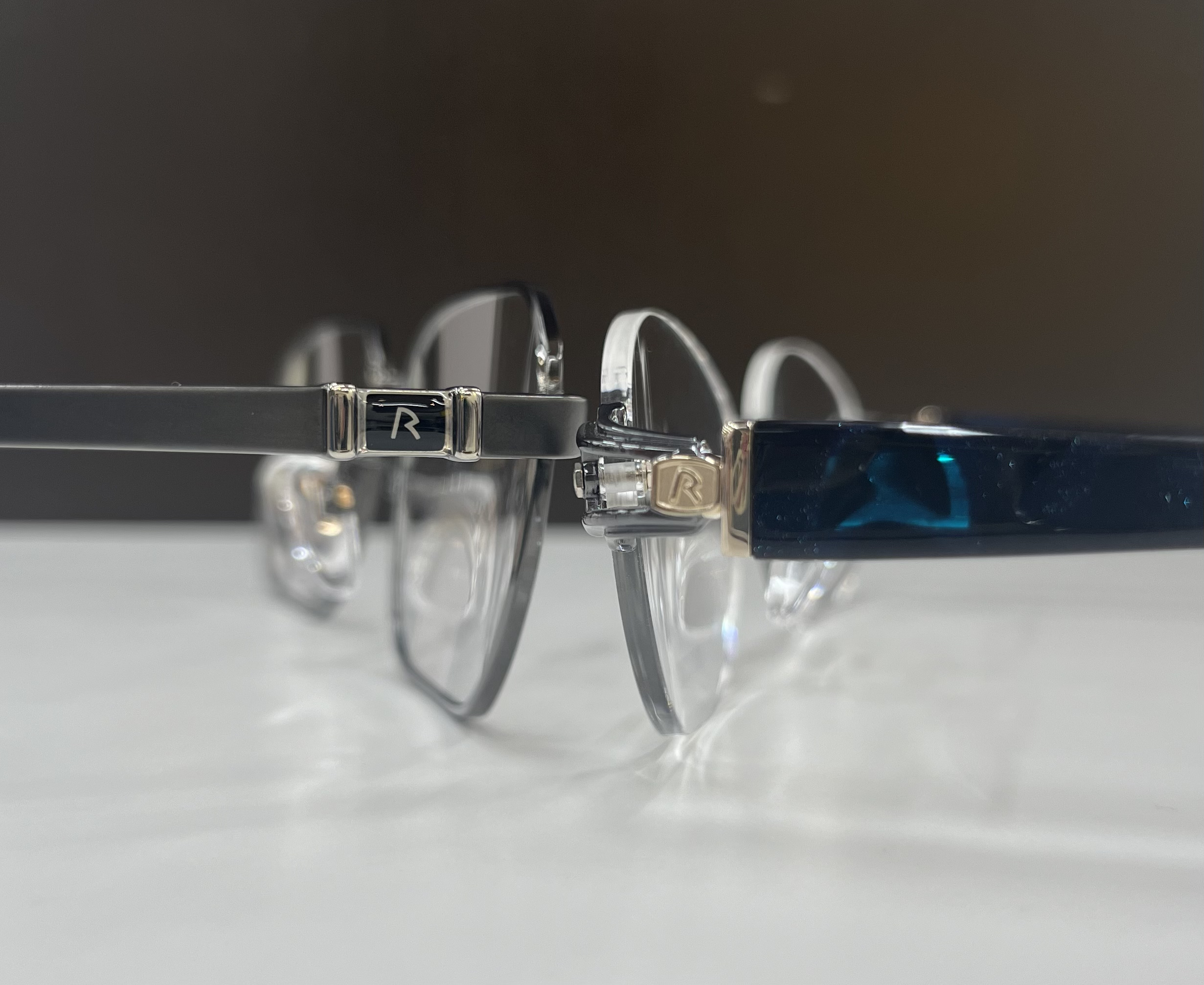 つる部分に刻印された「R」のマークが、高級感を引き立たせてい